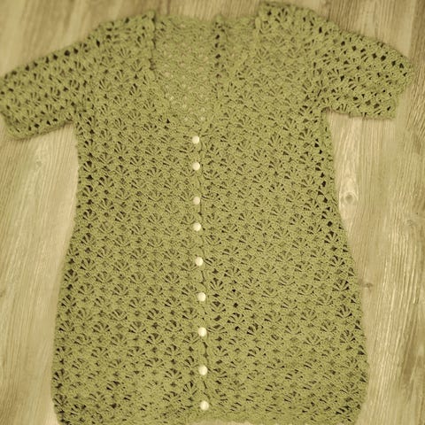 Myydään uusi, näyttävä, neulottu pitsineuletoppi. Neulottu Dropsin Muskat langasta. Väri tummanbeige. Koko M.