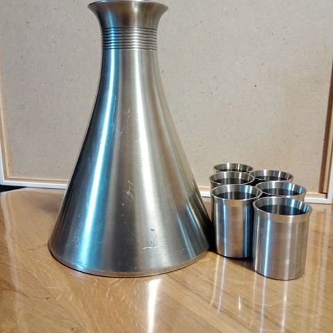 Tinapullo + kaksi isoa ja kahdeksan pientä snapsilasia. Tosin ei nuo isommat taida snapsilaseja olla...