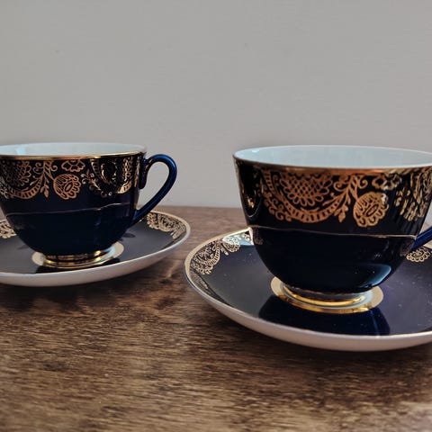 Lomosovin valmistamat "Golden Frieze"-sarjan kahvikupit ja tassit. Pinnoilla on hieman käytönjälkiä, esim. kultaosat ovat paikoin kuluneet. Yksittäin myytynä hinta on 4 euroa kuppiparia kohden.
