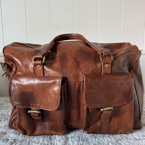 Saatu uutena ja käytetty muutaman kerran. Mukana kantovyö, joka saa kiinni ristiin. Päädyt saa kiinni reunoille tai niitä voi pitää auki. Jos pitää kiinni klipsuilla saa vähän ryhtiä laukkuun, mutta jos irti, saa lisää tilaa.