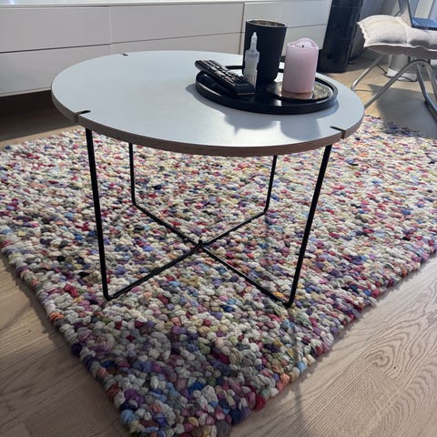 Tapio Anttilan suunnittelema Pedro sohvapöytä maitolasikannaella.