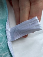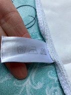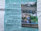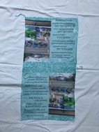 Tekstillä oleva käsipyyhe. Sama teksti ja kuva on kahteen eri suuntaan.