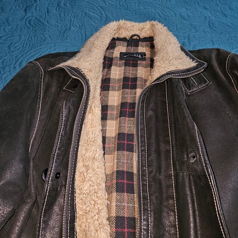Saksasta 2000-luvun alussa ostettu nahkatakki, nupukkia. Irrotettava tikkiliivi-vuori. Sen vetoketjusta vedin irronnut. Muuten täysin ehjä ja siisti takki. Kainalo-kainalo mitta: 55 cm, pituus niskasta helmaan: 70 cm. Helmassa kiristettävät soljet. Nappikiinnitys. Myös nouto mahdollinen Nummelasta tai Veikkolasta.