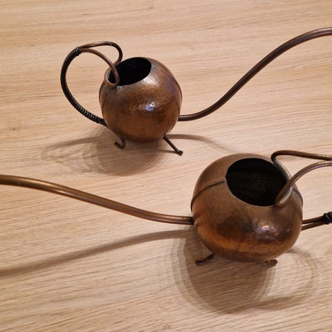 Antiikkinen kuparinen kastelukannu, jossa on koristeelliset kahvat ja yksityiskohtaiset koristeet. Kannun materiaali on kupari, ja kahvoissa on valkoiset koristeelliset osat. Soveltuu koriste-esineeksi tai käytettäväksi kasteluvälineenä.