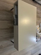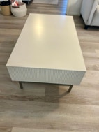 Beige sohvapöytä, jossa metalliset jalat. Pöydässä on säilytystila kahdella avoimella hyllyllä. Moderni ja yksinkertainen muotoilu, sopii erilaisiin sisustustyyleihin.