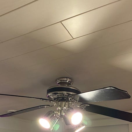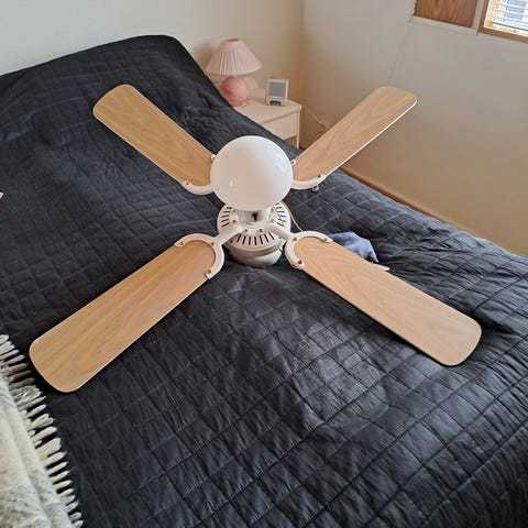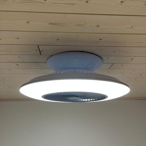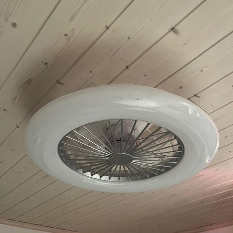Valkoinen kattotuuletin. Leveys siivestä siipeen 120cm. Täysin toimiva peli niin valot ku ropelliki. Kolme eri nopeutta