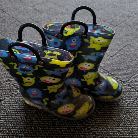 Myydään kumisaappaat kokoa 27. Muutoin ehjät, mutta varren reunasta sisus hieman irronnut liimauksestaan.