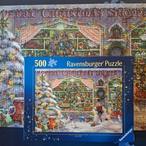 Puuhaa joulun välipäiviksi. Uudenveroiset, laadukkaat Ravensburgerin joulupalapelit. Kerran koottu, kaikki palat tallella. Kaksi palapeliä, molemmissa 500 palaa. Haku Tampereen keskustasta.