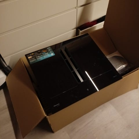 Uusi induktioliesitaso tuulettimella, avamattomassa paketissa. Tuli suunniteltua pienempi.