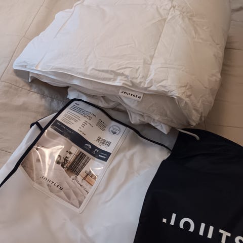 Kolmen viikon ajan käytetty untuvapeitto Joutsen Suoja. Erikoiskoko 200 x 220 cm, 750 g untuva/höyhen 60/40. Jäi ylimääräiseksi kun hankinkin toisen merkin peiton.
