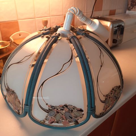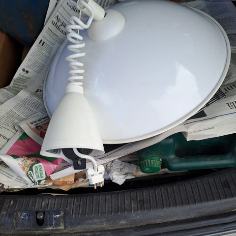 Toimiva, metallinen hissivalaisin pistokkeella. Lyhimmilleen säädettynä alareunan etäisyys katosta 70 cm.