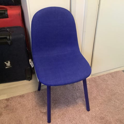 Runko lakattua koivua, selkänoja vaneria/viilua, istuinosassa ohut pehmuste verhoilun alla. Kahden tuolin selkänojassa pieni lohkeama viilussa. Rungoissa joitain pieniä jälkiä. Helppo verhoilla uudelleen, nykyinen Marimekon kivet kangas hyvässä kunnossa.