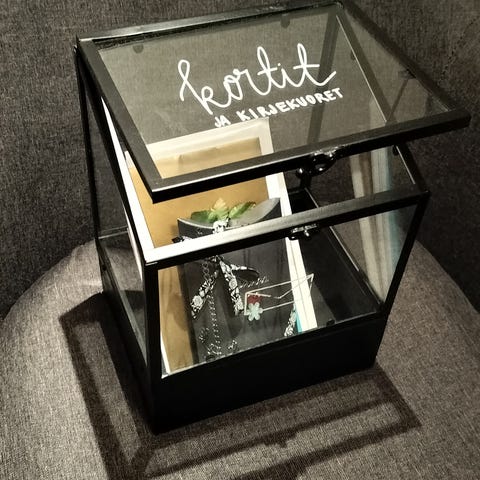 Myydään valkoinen kassattava laatikko korteille. Musta teksti kirjailtu. Kerran käytetty häissä. Ehjä. 30x30x30cm.