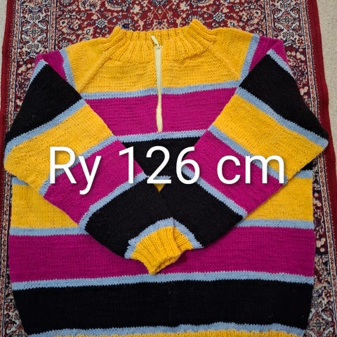 Traktoripusero XXL. Hihan pituus kai-hihan suu, 52 cm, kai-kai 63 cm, kai-helma 49 cm. Pusero on sininen ja harmaa. Lanka 60% villa, 20% polyamidi ja 20% polyester