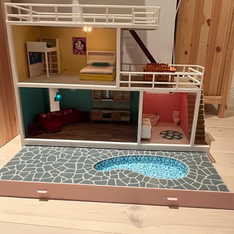 Kaikki kuvassa olevat kalusteet kuuluvat hintaan. Käytön jälkiä löytyy koska kyseinen nukkekoti on ostettu yli 10 vuotta sitten.