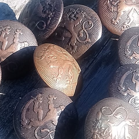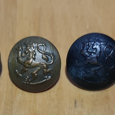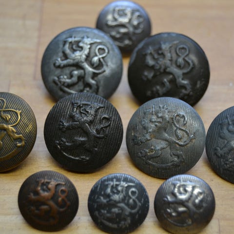 14 muovista harmaata armeijan leijonanappia. Halkaisija 2 cm. Yhteishinta 11 e.