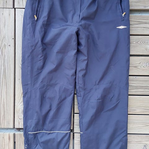Hyväkuntoiset Umbro-merkkiset urheiluhousut, kevyttä ja hengittävää materiaalia. Väri vaalea harmaanbeige, vuorattu ilmavalla verkkokankaalla. Vyötäröllä joustavaa kuminauhaa sekä nepparikiinnitys, housuissa myös pieni logo-yksityiskohta.