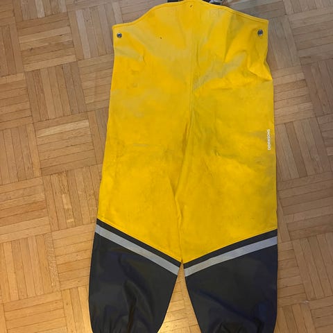 Erinomaisen kuntoiset sadehousut. Jalkalenkit hieman rispaantuneet. Ei muita käytönjälkiä.