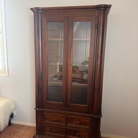 Hyväkuntoinen vitriinikaappi, 2 lasihyllyä, 1 puuhylly ja ovellinen kaapisto jossa 2 hyllytasoa. Lasi- ja puuosat hyväkuntoiset. Ei kolhuja eikä naarmuja. Väri ruskea.