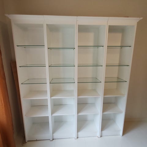 Puinen vitriinikaappi lasiovilla ja kahdella kaapistohyllyllä