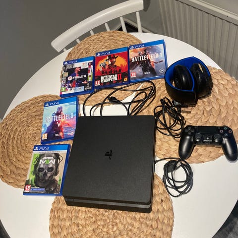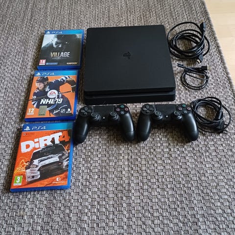Myydään hyväkuntoinen PS4 Slim 500 GB -konsoli kahdella toimivalla ohjaimella ja neljällä pelillä (FIFA 18, FIFA 19, Call of Duty: WWII, Assassin’s Creed Odyssey). Nouto Tampereelta tai postitus ostajan kustannuksella.