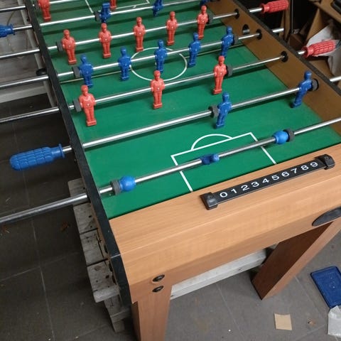Jykevä foosball-peli. Mitat pituus 140cm, leveys 75cm ja korkeus 85cm.
