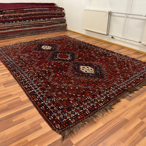 Upea käsin solmittu persialainen matto. Shiraz-matto on kauneimmista kokonaan villasta kudotuista persialaisista matoista. Virheetön matto, kuin vastakudottu.