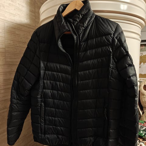 Musta untuvatakki. Resori kauluksessa, helmassa ja hihansuissa. Kaksisuuntainen vetoketju, sivuissa reilun kokoiset taskut vetoketjuilla. Hihassa vetoketjullinen koristetasku. Mitat n. olka-helma 92, kainalo-kainalo 57, hihan pituus olkasaumasta 63 cm takin päältä mitattuna. Uudenveroinen, jäänyt käyttämättä.