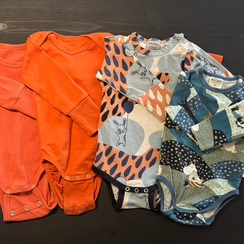 Merkkeinä esim Martinex Muumi, Lindex, Kappahl, Peuhu, pari äitiyspakkauksen bodyja, me&i.