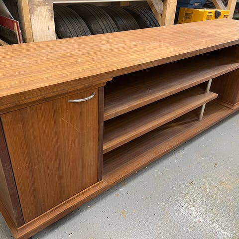 Hieno ja korkealaatuinen massiivipuinen senkki, noin 20 vuotta vanha, ollut TV tasona suurimman osan aikaa. Tasopinnassa jonkin verran ajan myötä värivaihtelua, mutta pinnat täysin ehjiä.