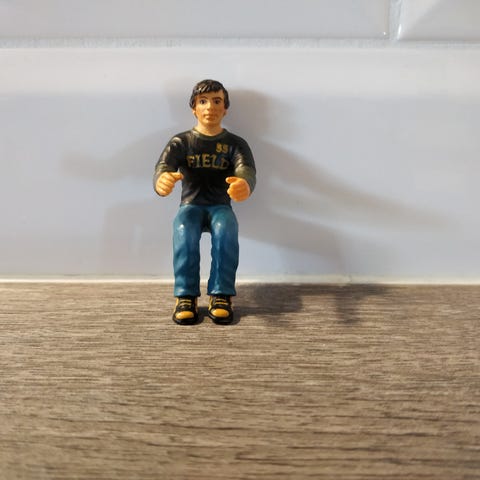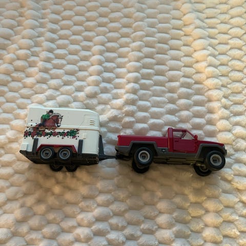 Schleich autotalli ja maastoauto kuljettajalla, täysin ehjät. Kuljettaja meinasi kuvista jäädä pois, mutta on nyt kuvattuna loppukuvissa. Kahdessa kuvassa on autotallin noin mittoja.