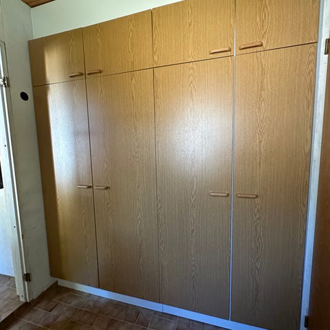 Tästä sopivaa kaappia autotalliin tai varastoon. Osa levyistä ottanut väriä/kosteutta. Muuten kohtalainen kunto.