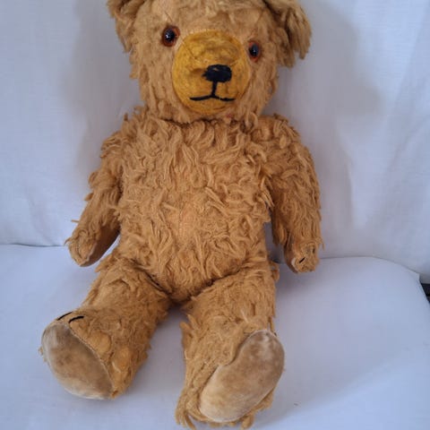 Vanha nalle, vaalea lila väriltään.