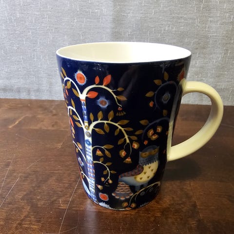 Iittala Taika muki, valmistettu keraamisesta materiaalista. Mukin väri on punainen, ja siinä on värikäs kuvitus, jossa esiintyy lintuja ja puita. Muki soveltuu käyttöön keittiössä ja kahvin tai teen nauttimiseen.