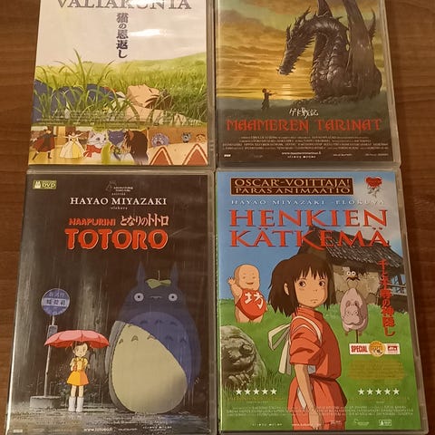 Disney / anime-leffoja. Prinssesa Ruusunen, Miekka Kivessä, 101 Dalmatialaista, Hayao Miyazakin Liikkuva Linna, Ankronikka Kadonneen Lampun metsästäjät ja Robin Hood. Kaikki yhteensä 10e.