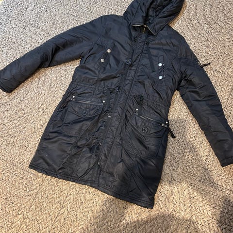 Siistikuntoinen parkatakki, väri sinimusta. Tikattu vuori, päällinen puuvillaa. Iso huppu ja vyötäröllä säätömahdollisuus. Kokomerkintä S, mutta menee M-kokoisellekin: kai-kai 52 cm ja olka-helma 83 cm.