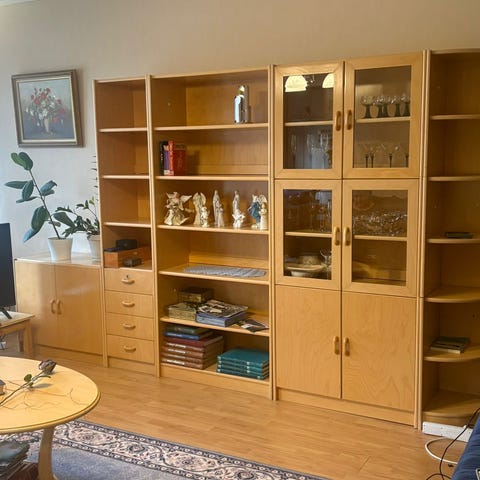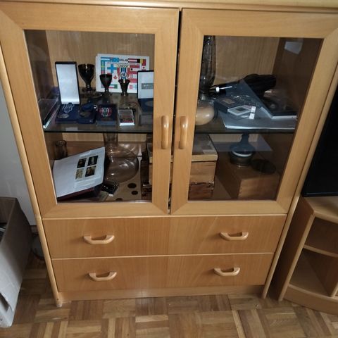 Alaosia, lasikaapin ovia, umpiovia, hyllylaudat, lasihyllyt ja laatikko-osa.