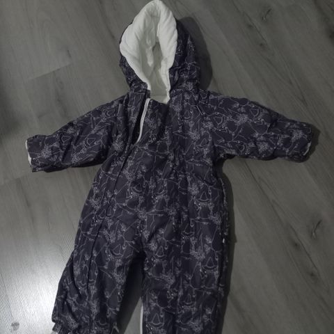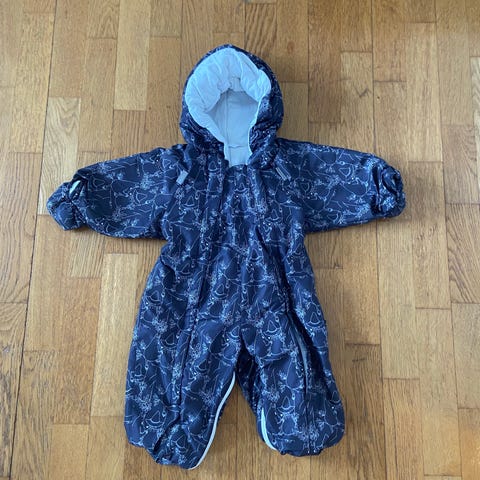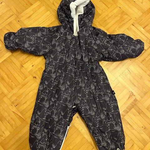 Muumiaiheinen käytetty ja ehjä toppahaalari koossa 68-74. Hihansuut käännettävät, vetoketjun ja neppareiden avulla saa myös pussiksi.
