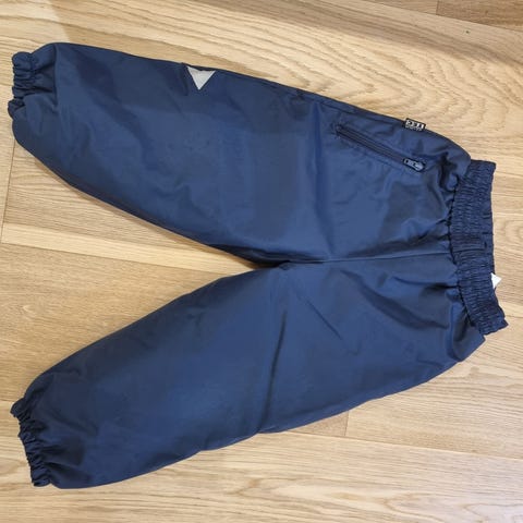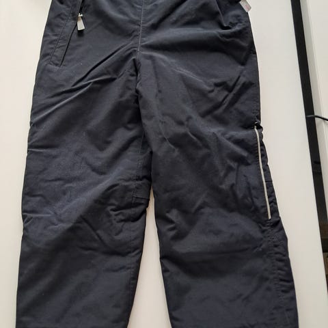 Kevyt toppaus, kestävä materiaali ulkoiluun, ulkohousut vähän viileämpään kevääseen ja leutoon talveen tai kylmempään pitkillä kalsareilla. Unisex käy tytöille ja pojille. Musta ja heijastimet. Tasku, vyötärökiristys lukollisella kuminauhalla. Vetoketjut lahkeensuissa, saa talvikengän päälle. Lahkeissa lumilukot. Polvissa jonkin verran kulumaa. Lahkeessa on kulumaa enemmän, ks kuva. Pyllyssä ei kulumaa liioin. Sopii vaikka lasketteluun tai päiväkotiin lumileikkeihin