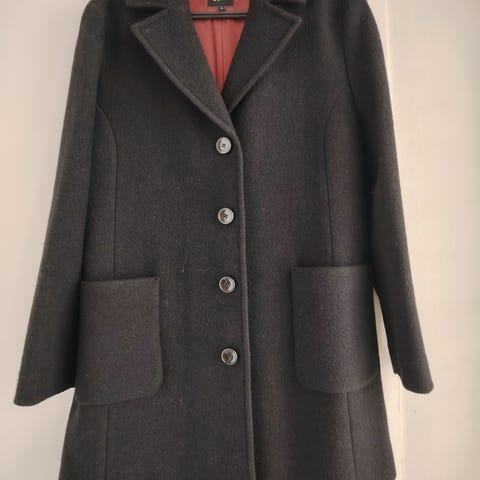 Hieman nukkaantunut ja sisävuori hieman rispaantunut saumojen kohdalta muutamassa kohdassa (näkyy kuvissa), mutta muuten erittäin siistissä kunnossa. Edessä 2 taskua, nappikiinnitys, takana halkio ja vyö tulee mukana. Vastaa EU kokoa 48-50. Pituus olka-helma n. 105 cm, kainalo-helma n. 80 cm ja mitta kainalosta kainaloon n. 57 cm. 75% villaa, 20% viskoosia ja 5% polyesteria.
