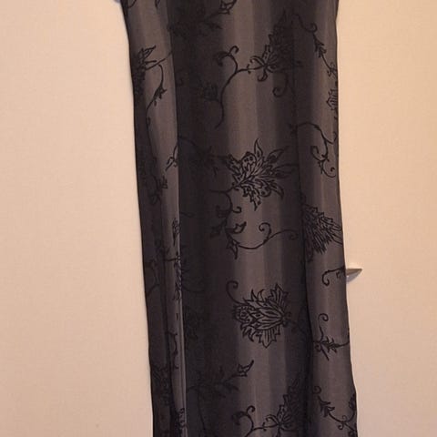 Myydään beigemusta, kuviollinen, pitkä mekko ja hupparijakku. Mekossa vetoketju takana ja edessä pitkä halkio. (100% viskoosia)