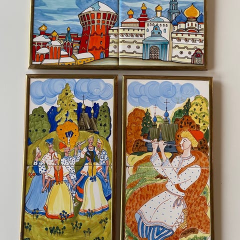 Koivuvaneri taulut, 3 kappaletta. Vaneri aaltoilee ja niissä näkyy puun syykuvio. Pieniä epätasaisuuksia ja käytön jälkiä ja yhdessä reikä joka ei erotu seinällä ollessaan. Voi käyttää kummin päin vain. Alkuperäiset kannattimet tallella.