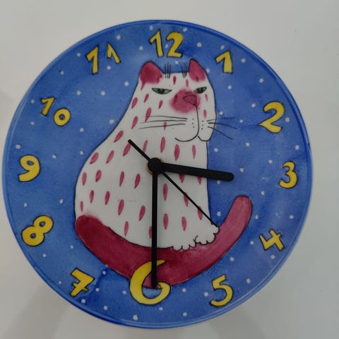Seinäkello. Leveys 25 cm ja pituus 30 cm.Toimii patterilla.