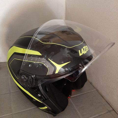 Lazer mattamusta FF950 mallin avattava kypärä. Koko L. Integroitu aurinkovisiiri. Visiirissä naarmuja ja pieniä jälkiä. Kypärässä pieniä kolhuja. Niistä kuvat