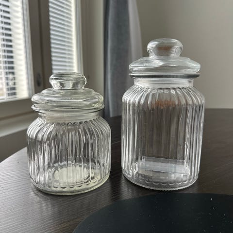 Kolmen osan setti sinisiä ja valkoisia koristeellisia purkkeja, joissa on kansi. Purkit ovat erikokoisia ja niissä on yksityiskohtaiset kuviot. Materiaali ei ole määritelty, mutta purkit sopivat koristekäyttöön tai säilytykseen.