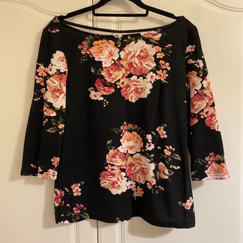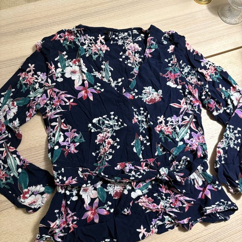 HM viskoosipusero jossa kukkakuosi. 100% viskoosia. Kauniit puffimaiset hihat, ja takana niskassa pieni napillinen aukko. Ollut vain kaksissa juhlissa päällä, kuin uusi. Koko s, käytetty s/M kokoisena.