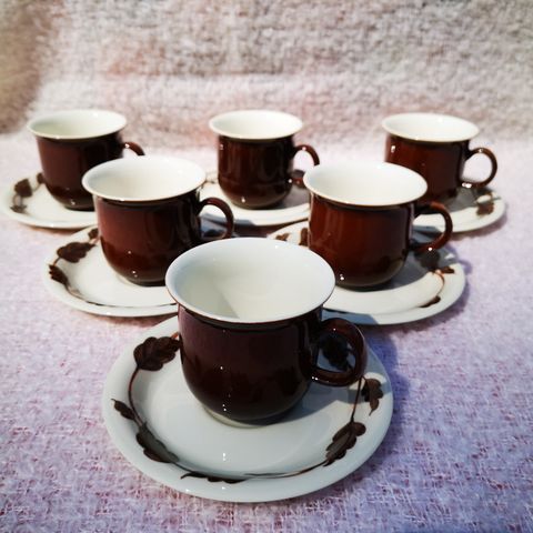 Myyn kuvassa näkyvän Arabian Kastanja kahvikuppisarjan. Sarjan on suunnitellut Inkeri Leivo. Kuppeja 7kpl, tasseja 8kpl. Kupit ja tassit täysin ehjiä. Tälle sarjalle vain nouto.