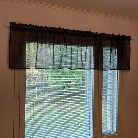 Ruskea / hopeansävyinen verhokappa. Leveys 295 cm ja korkeus 60 cm. Tankokuja. Kaksi koristetyynyn päällistä 43x43 cm.