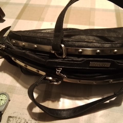 Musta nahkalaukku, useita lokeroita, koko 23×12 cm, olkahihna on.