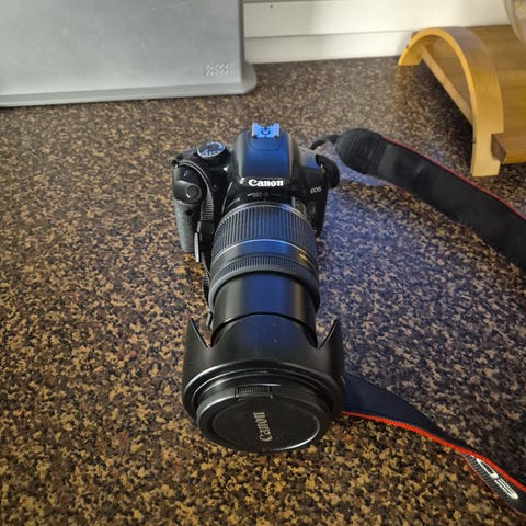 Canon s5is, mukana lisävarusteita kuten ulkoinen salama, kameran laukku ja laturi. Kamera soveltuu valokuvaukseen ja sisältää perusasetukset ja objektiivin. Lisävarusteet parantavat käytettävyyttä ja kuljetettavuutta.